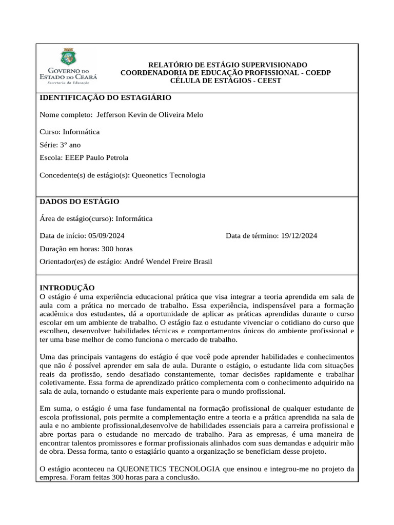 Concedente(s) de estágio(s): Queonetics Tecnologia