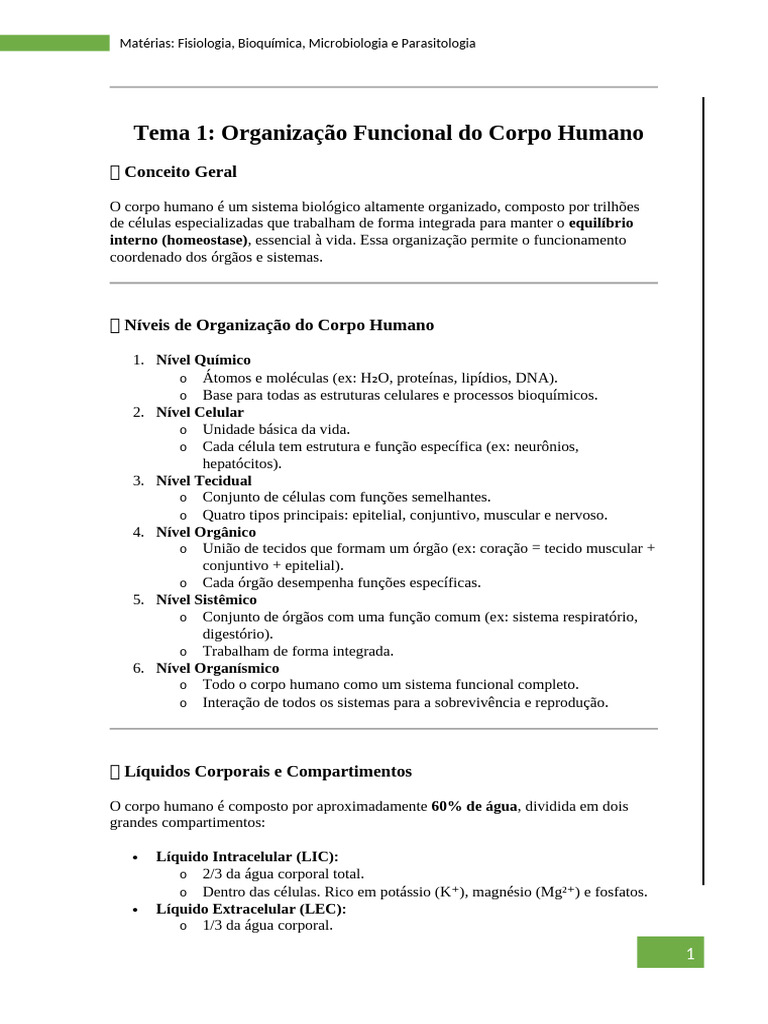 🧠 Tema 1: Organização Funcional do Corpo Humano