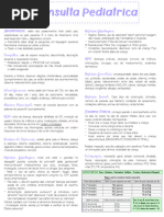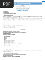 HISTRIA ALIMENTAR Idade em que se estendeu o aleitamento natural. Procurar existncia de erros alimentares grosseiros. HISTRIA IMUNOLGICA (vacinas) HISTRIA FAMILIAR (irmos, tios, avs, pais e contactantes) Idade dos pais, consanginidade, doena de carter familiar e infecto contagiosa. HISTRIA SCIO-ECONMICA Grau de instruo dos pais, profisso, renda familiar, condies de moradia e de higiene do ambiente (ventilao, insolao, disponibilidade de gua e esgoto), mora na cidade ou no campo, etc. DESENVOLVIMENTO NEUROPSICOMOTOR Idade em que firmou a cabea, sentou, andou, falou, controle dos esfncteres. ISDA (Interrogatrio sobre diversos aparelhos) 1. Geral: apetite, atividade, choro, sono, alteraes do peso, febre, sudorese. 2. Olhos: edema palpebral, enoftalmia, conjuntivite, acuidade visual, ardor. 3. Nariz: epistaxe, coriza, obstruo. 4. Boca e garganta: dor, disfagia, salivao, dentio, respirao bucal, leses, rouquido. 5 Ouvidos: dor, otorria, audio. 6. Cabea: fontanelas, cefalias, tonturas. 7. Anexos, pele e mucosas: palidez, ictercia, prurido, assaduras, alteraes dos plos. 8. Pulmes e corao: deformidades torcicas, dor, tosse, expectorao, dispnia, cianose, ronqueira, chiado no peito, palpitao. 9. Aparelho digestivo: dor, nusea, vmito, regurgitao, intolerncia alimentar, polifagia, polidipsia, alteraes intestinais, eliminao de vermes, prurido anal, regurgitao. 10. Aparelho gnito-urinrio: dor, disria, polaciria, alteraes do volume urinrio, cor da urina, incontinncia urinria, enurese, urina em jato, corrimento vaginal, leses genitais, testculos. 11. Membros e coluna vertebral: dor, edema, tumefao articular, impotncia funcional, deformidades, leses, tumoraes, marcha. 12. Sistema nervoso: sonolncia, insnia, irritabilidade, perda de conscincia, convulses, movimentos involuntrios, alteraes da conduta, confuso mental, paresias, paralisias. Roteiro para Exame Fsico Dados Antropomtricos. Temperatura. Inspeo Geral. Fcies. Atividade, atitude, estado de nutrio e hidratao, movimentos, aparncia geral, fcies.