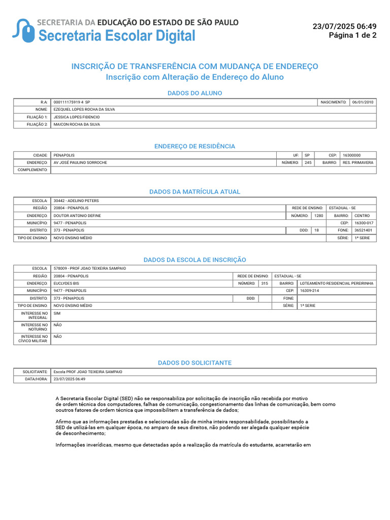 A Secretaria Escolar Digital (SED) não se responsabiliza por solicitação de inscrição não recebida por motivo