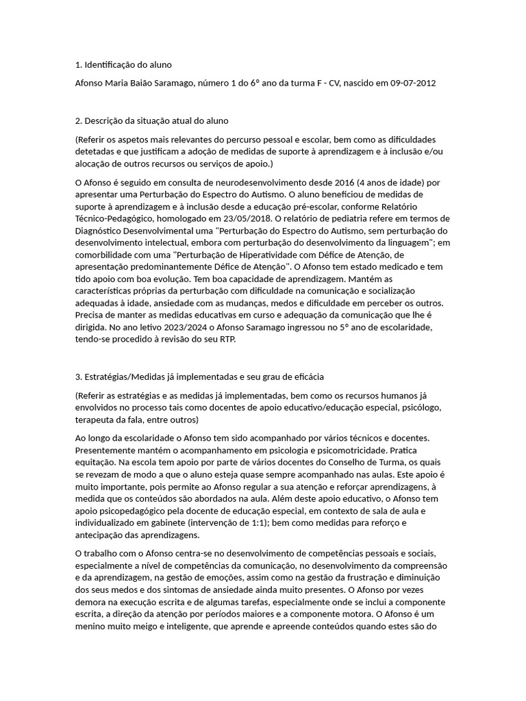 apresentar uma Perturbação do Espectro do Autismo. O aluno beneficiou de medidas de