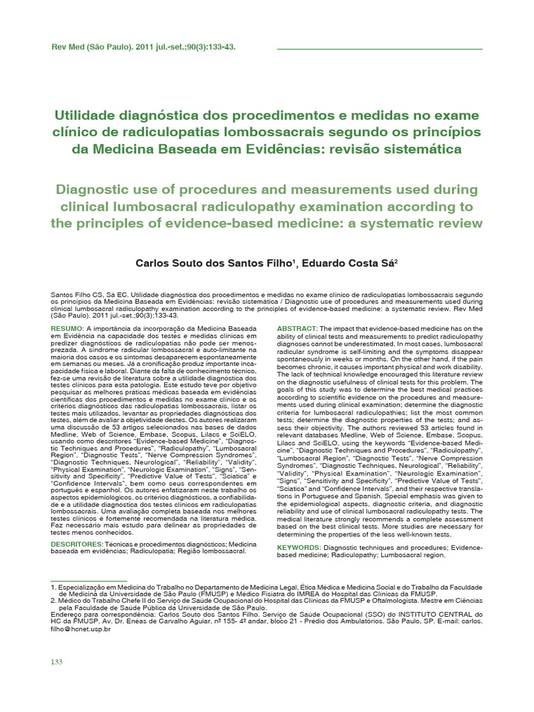 Santos Filho CS, Sá EC. Utilidade diagnóstica dos procedimentos e medidas no exame clínico de radiculopatias lombossacrais segundo