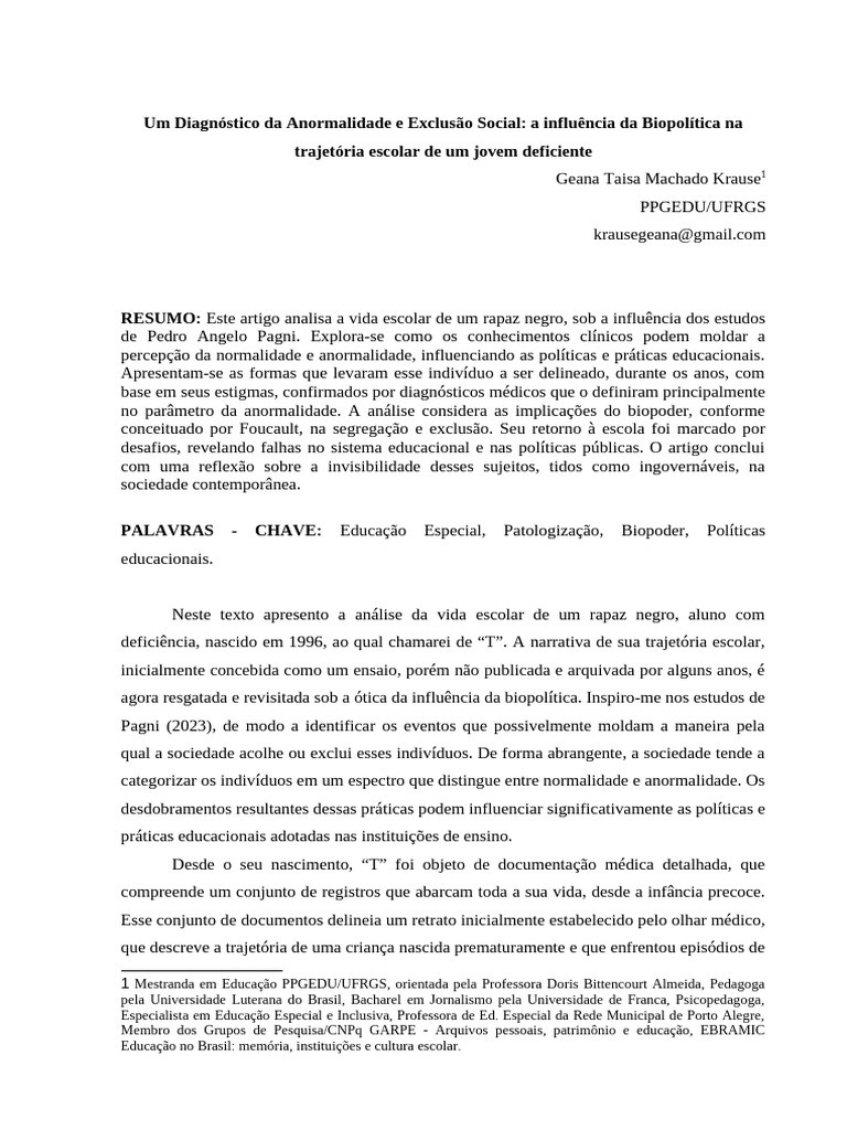 PALAVRAS - CHAVE: Educação Especial, Patologização, Biopoder, Políticas