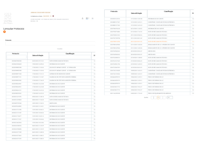 20258590987698 17/02/2025 [Link] LIGACAO P/ MESMO CLIENTE - UC DESLIGADA Co 20247552847019 16/10/2024 [Link] NOTA DE RECLAMACAO TECNICA Co