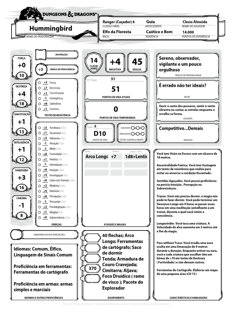 NOME DO PERSONAGEM RAÇA TENDÊNCIA PONTOS DE EXPERIÊNCIA