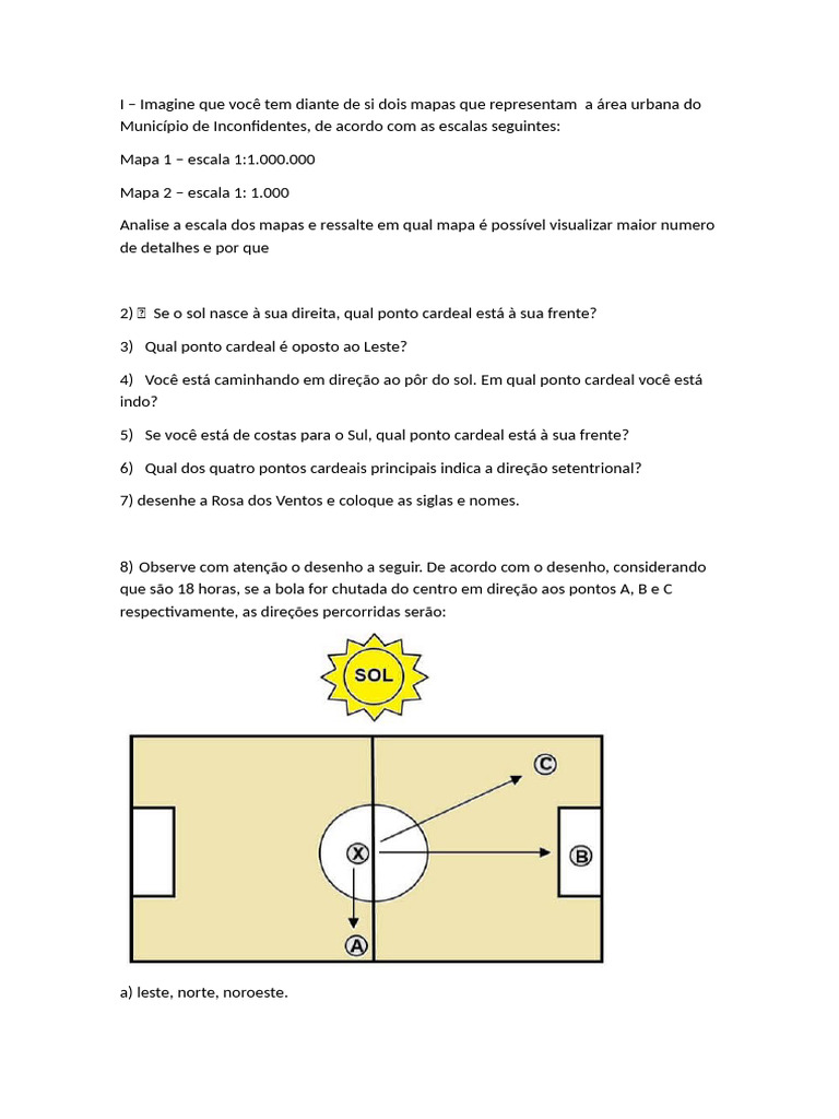 2) Se o sol nasce à sua direita, qual ponto cardeal está à sua frente?