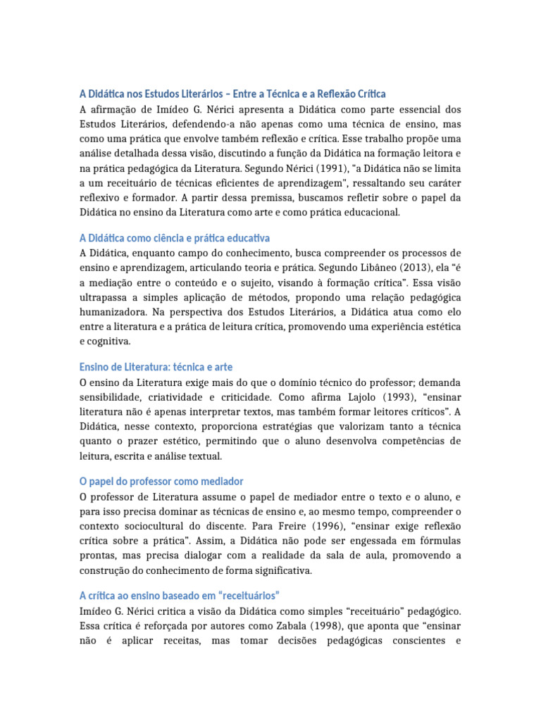 na prática pedagógica da Literatura. Segundo Nérici (1991), "a Didática não se limita