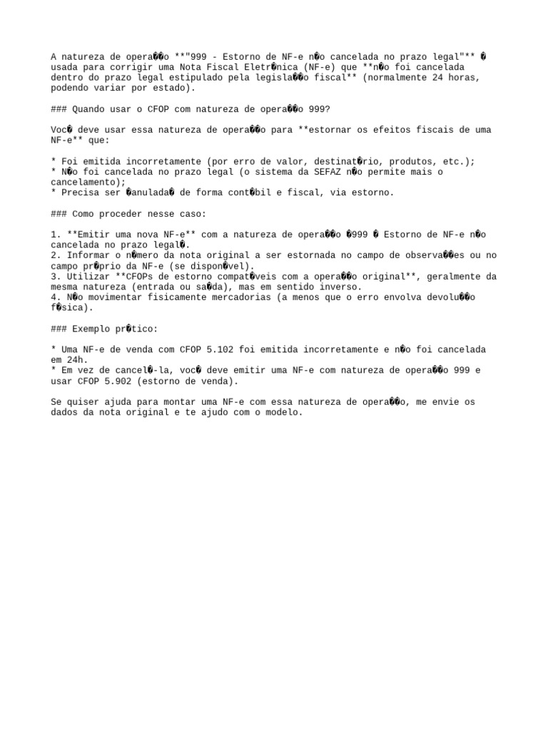 A natureza de opera��o **"999 - Estorno de NF-e n�o cancelada no prazo legal"** �