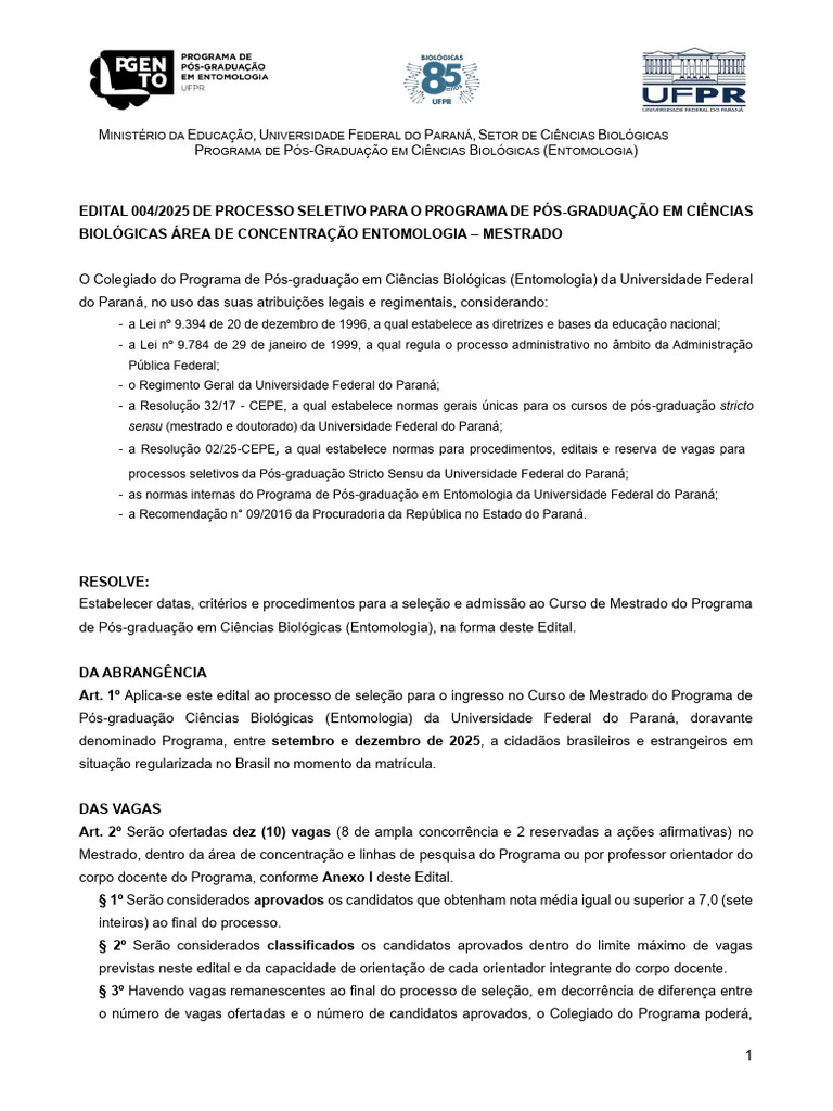 de Pós-graduação em Ciências Biológicas (Entomologia), na forma deste Edital.