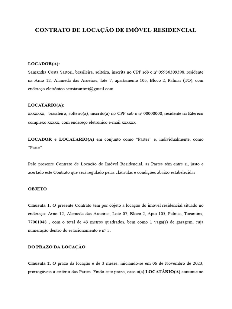 Cláusula 1. O presente Contrato tem por objeto a locação do imóvel residencial situado no