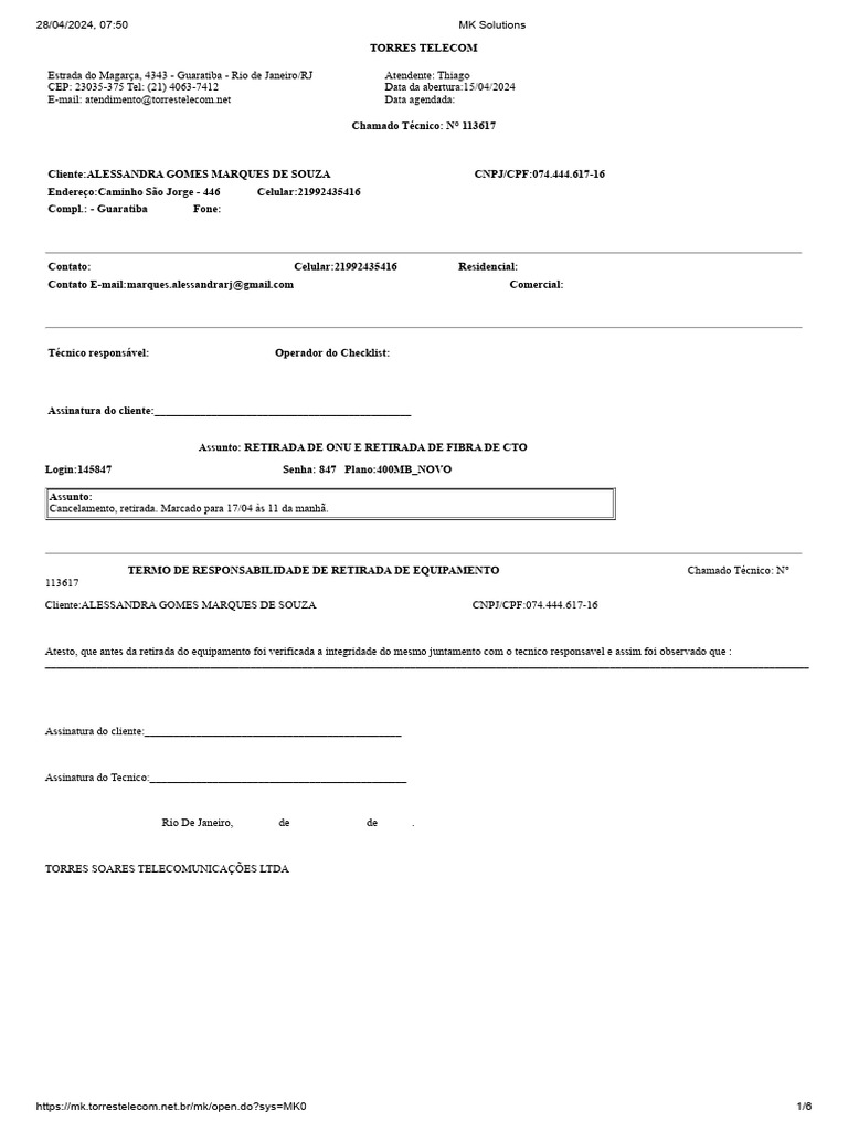 Cliente:ALESSANDRA GOMES MARQUES DE SOUZA CNPJ/CPF:074.444.617-16