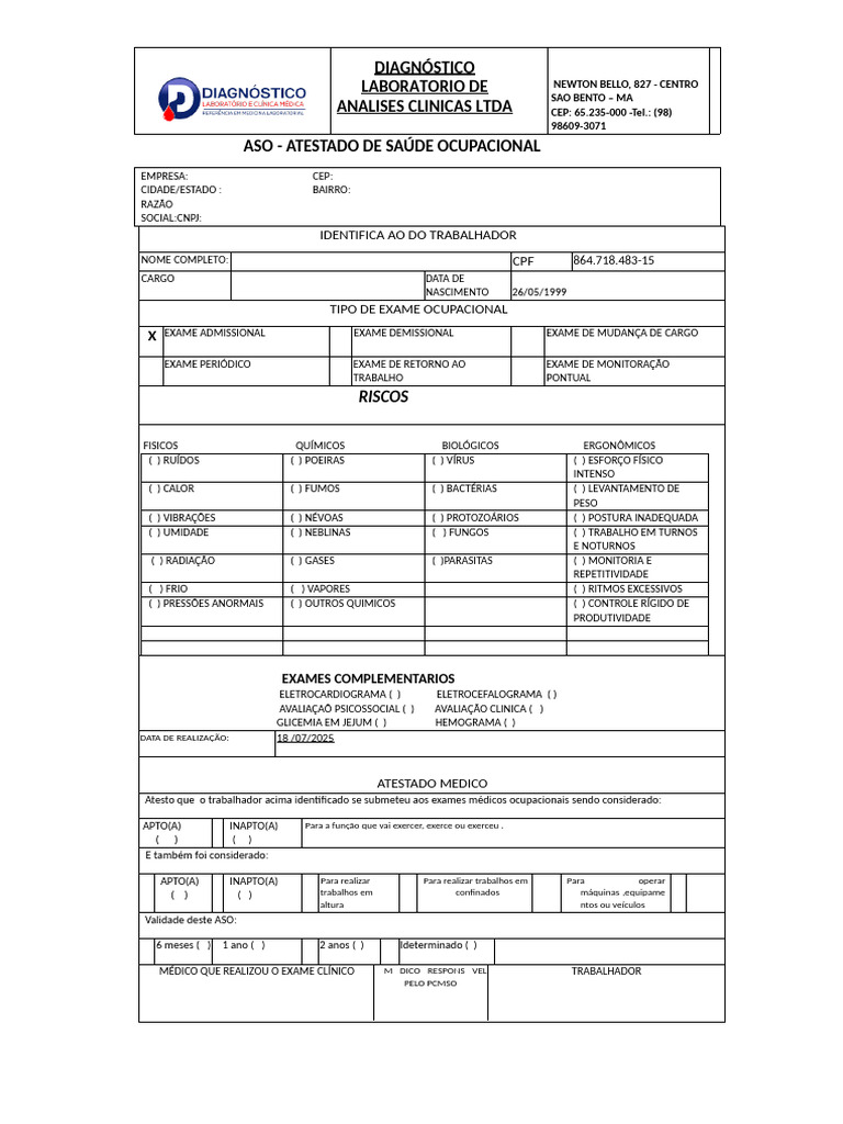 Atesto que o trabalhador acima identificado se submeteu aos exames médicos ocupacionais sendo considerado: