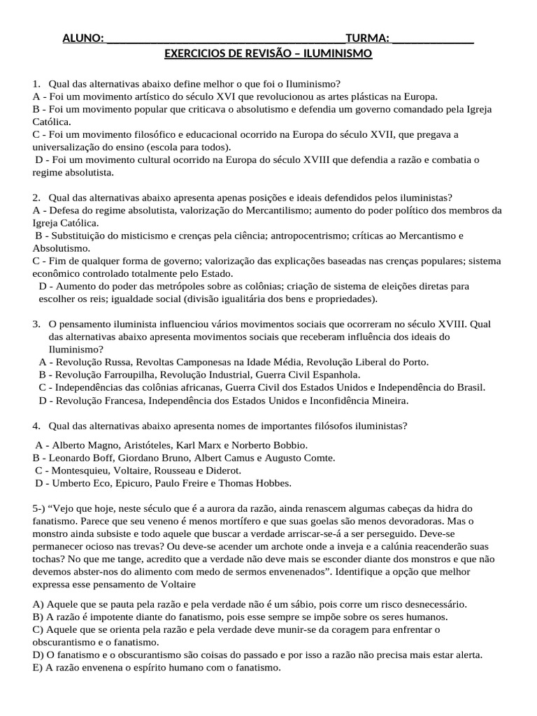 EXERCICIOS DE REVISÃO – ILUMINISMO