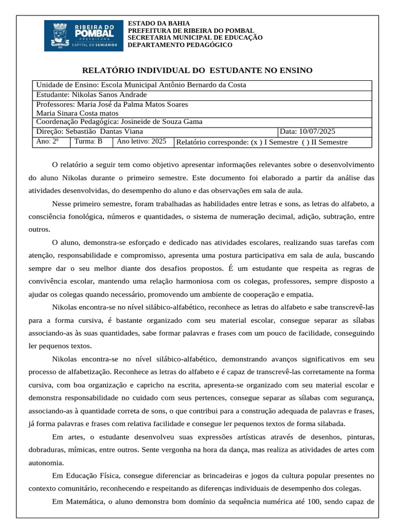 Ano: 2º Turma: B Ano letivo: 2025 Relatório corresponde: (x ) I Semestre ( ) II Semestre