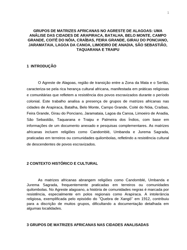 (terreiros de Candomblé). Para Batalha, Belo Monte, Campo Grande, Craíbas, Feira