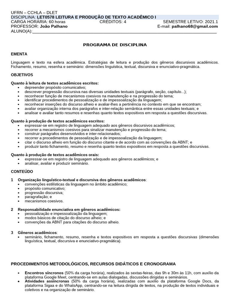 DISCIPLINA: LET0578 LEITURA E PRODUÇÃO DE TEXTO ACADÊMICO I
