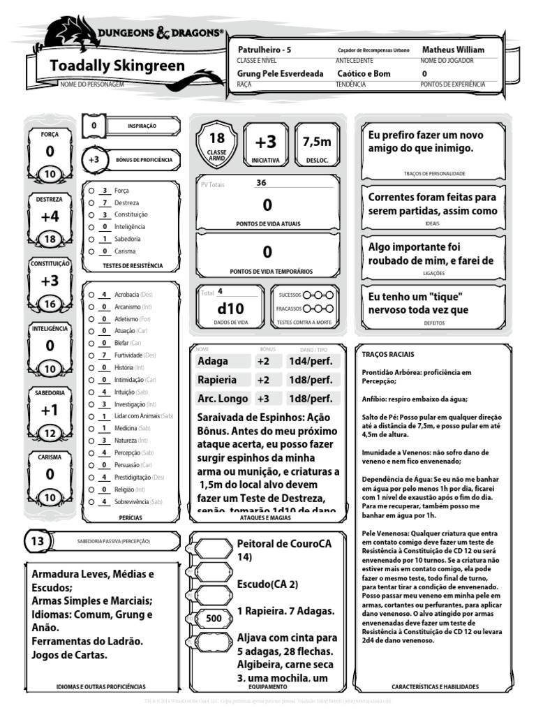 NOME DO PERSONAGEM RAÇA TENDÊNCIA PONTOS DE EXPERIÊNCIA