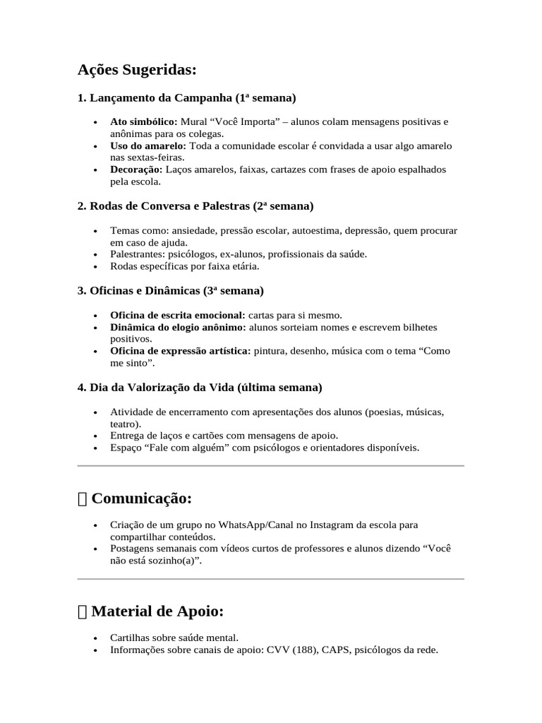 Informações sobre canais de apoio: CVV (188), CAPS, psicólogos da rede.