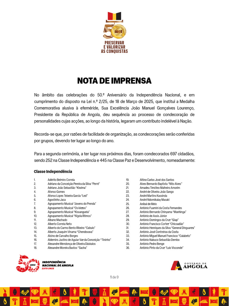 cumprimento do disposto na Lei n.º 2/25, de 18 de Março de 2025, que institui a Medalha