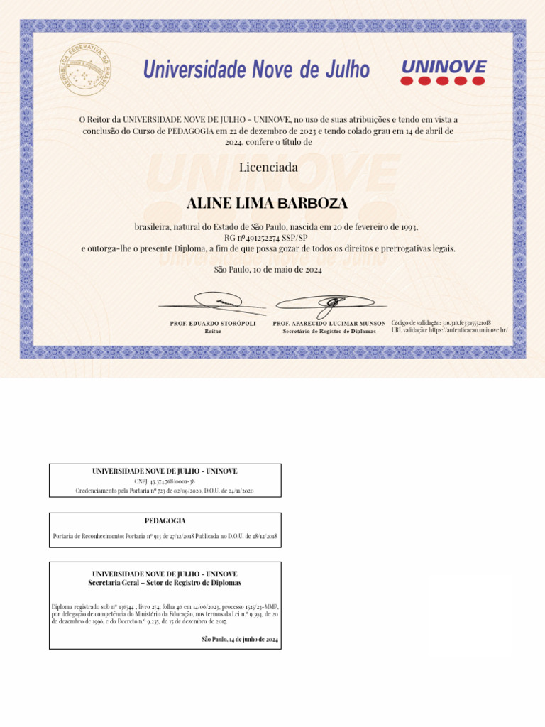 conclusão do Curso de PEDAGOGIA em 22 de dezembro de 2023 e tendo colado grau em 14 de abril de