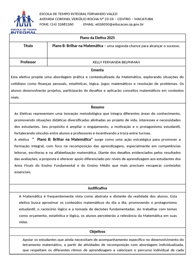 A eletiva “ Plano B: Brilhar na Matemática” surge como uma ação estratégica para promover a
