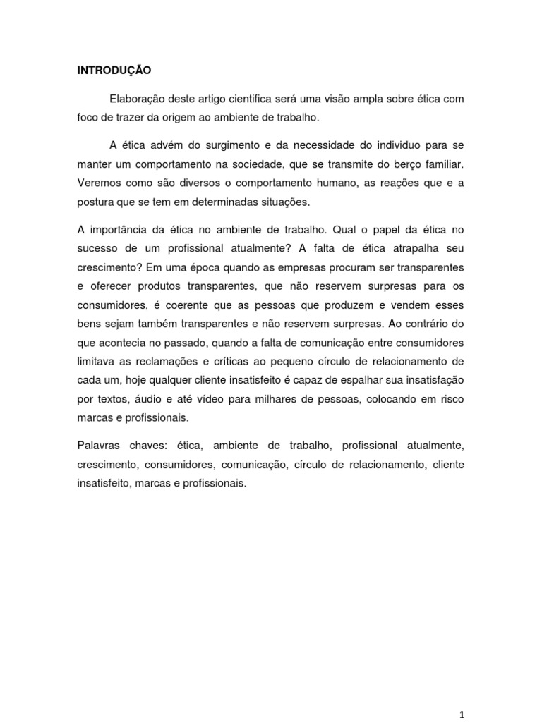 ao ambiente de trabalho. A tica advm do surgimento e da necessidade do individuo para se manter um comportamento na sociedade, que se transmite do bero familiar. Veremos como so diversos o comportamento humano, as reaes que e a postura que se tem em determinadas situaes. A importncia da tica no ambiente de trabalho. Qual o papel da tica no sucesso de um profissional atualmente? A falta de tica atrapalha seu crescimento? Em uma poca quando as empresas procuram ser transparentes e oferecer produtos transparentes, que no reservem surpresas para os consumidores, coerente que as pessoas que produzem e vendem esses bens sejam tambm transparentes e no reservem surpresas. Ao contrrio do que acontecia no passado, quando a falta de comunicao entre consumidores limitava as reclamaes e crticas ao pequeno crculo de relacionamento de cada um, hoje qualquer cliente insatisfeito capaz de espalhar sua insatisfao por textos, udio e at vdeo para milhares de pessoas, colocando em risco marcas e profissionais. Palavras chaves: tica, ambiente de trabalho, profissional atualmente, crescimento, consumidores, comunicao, crculo de relacionamento, cliente insatisfeito, marcas e profissionais.