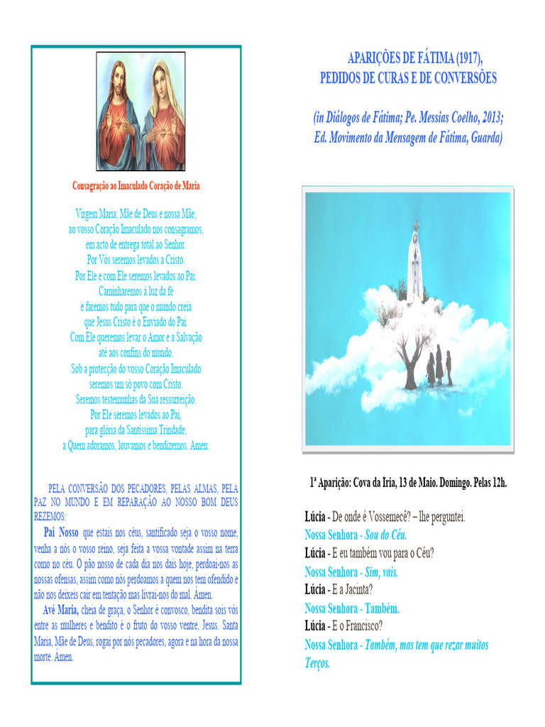 PELA CONVERSÃO DOS PECADORES, PELAS ALMAS, PELA 1ª Aparição: Cova da Iria, 13 de Maio. Domingo. Pelas 12h.