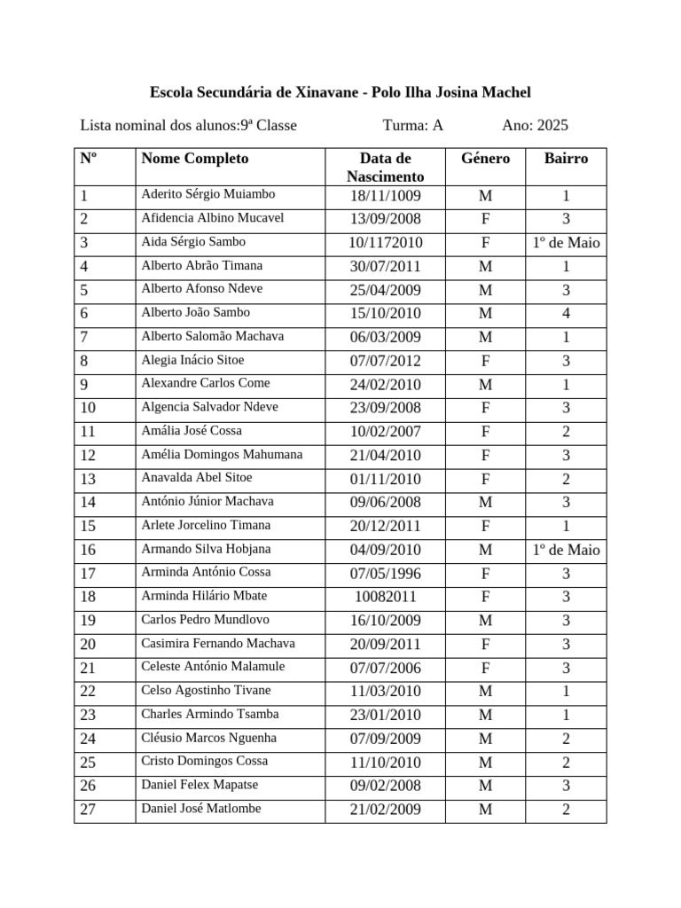 Lista nominal dos alunos:9ª Classe Turma: A Ano: 2025