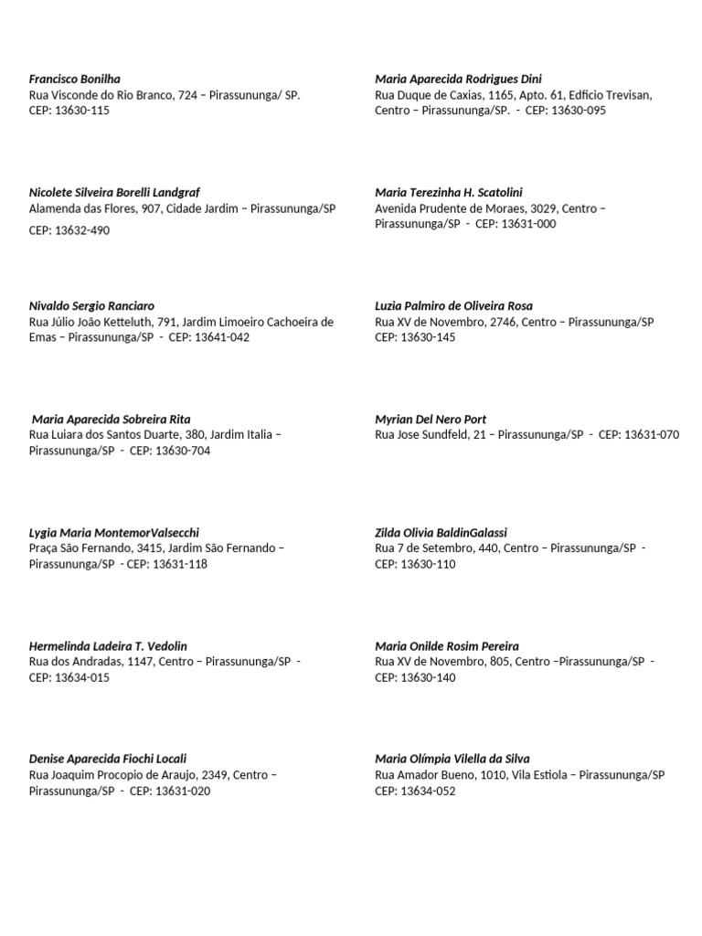 Rua Coronel Franco, 2997, Centro – Pirassununga/SP Avenida Padre Leo Lunders, 1784, Vila Guilhermina –