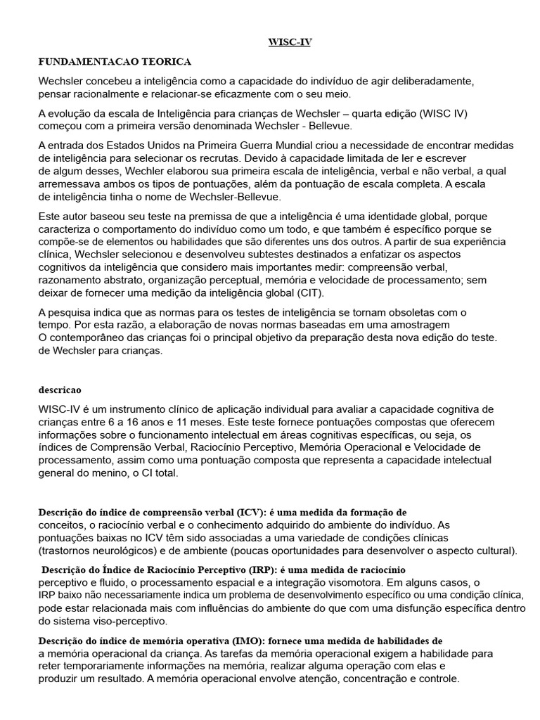 WISC-IV é um instrumento clínico de aplicação individual para avaliar a capacidade cognitiva de