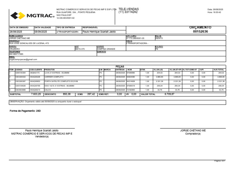 MGTRAC COMERCIO E SERVICOS DE PECAS IMP E EXP LTDA TELE-VENDAS Data: 26/08/2025