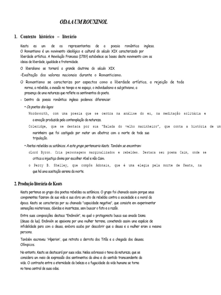 Ode a um rouxinol. Compara o sofrimento humano com a imortalidade do canto do rouxinol.