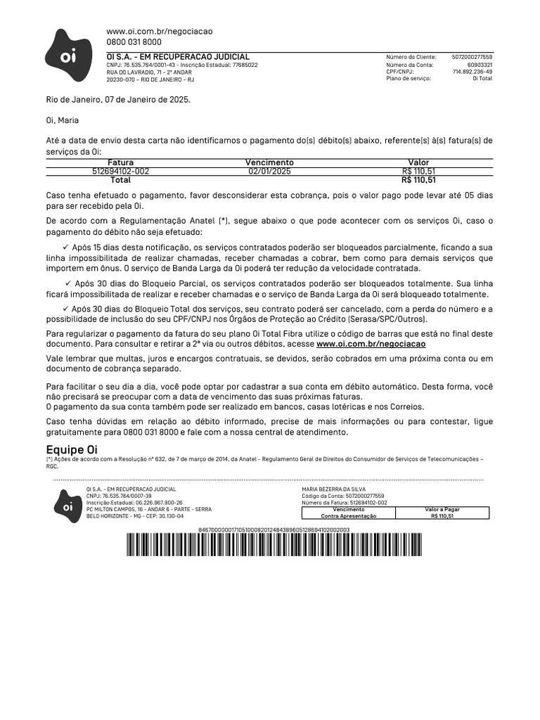 OI S.A. - EM RECUPERACAO JUDICIAL MARIA BEZERRA DA SILVA