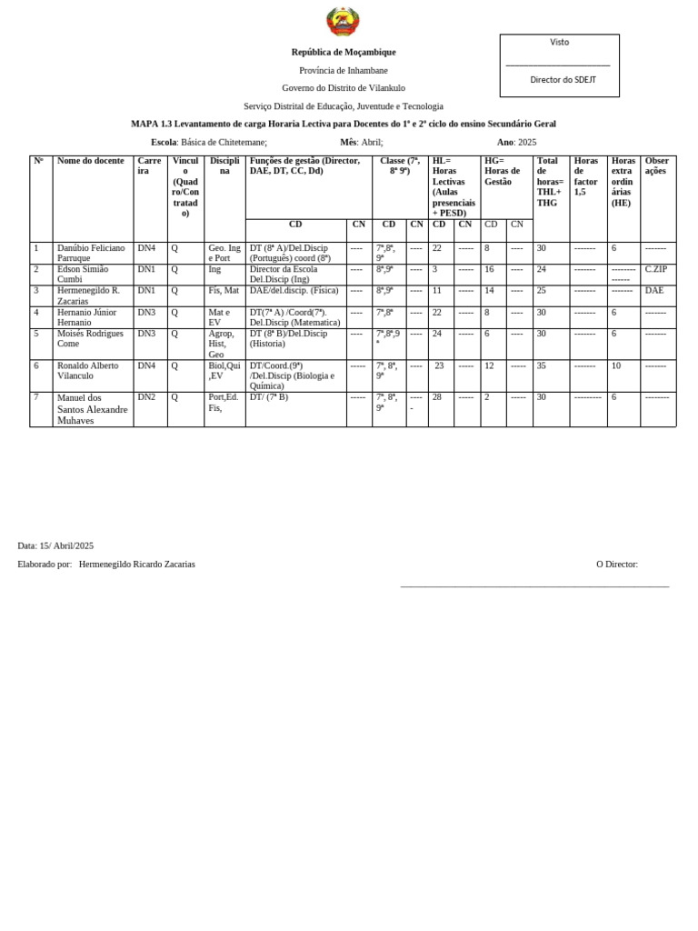 Escola: Básica de Chitetemane; Mês: Abril; Ano: 2025