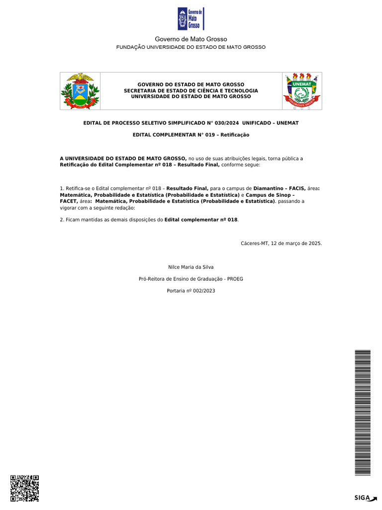 1. Retifica-se o Edital complementar nº 018 – Resultado Final, para o campus de Diamantino – FACIS, área: