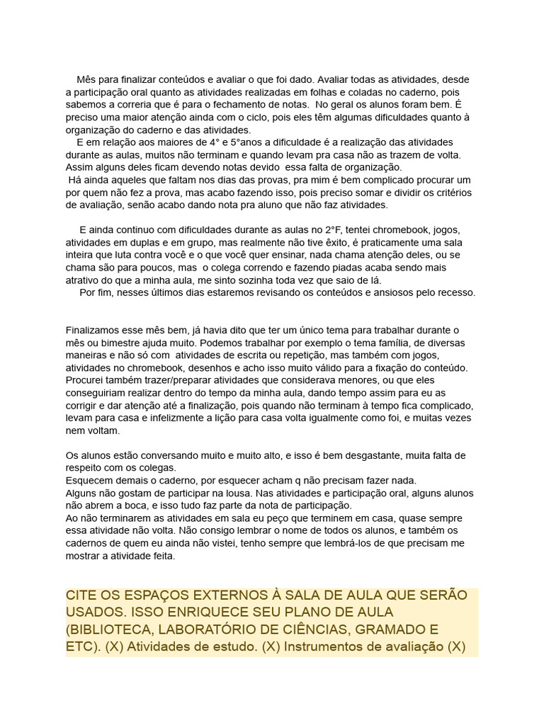 Mês para finalizar conteúdos e avaliar o que foi dado. Avaliar todas as atividades, desde