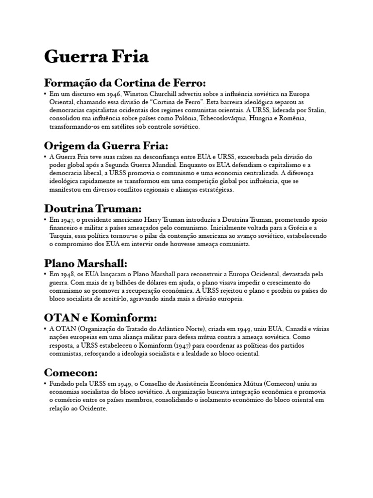 • A Guerra Fria teve suas raízes na descon ança entre EUA e URSS, exacerbada pela divisão do