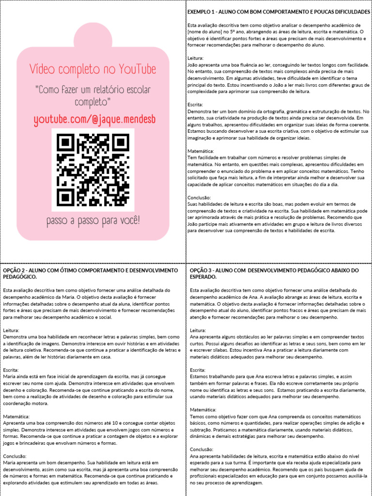desempenho acadêmico da Maria. O objetivo desta avaliação é fornecer desempenho acadêmico de Ana. A avaliação abrange as áreas de leitura, escrita e