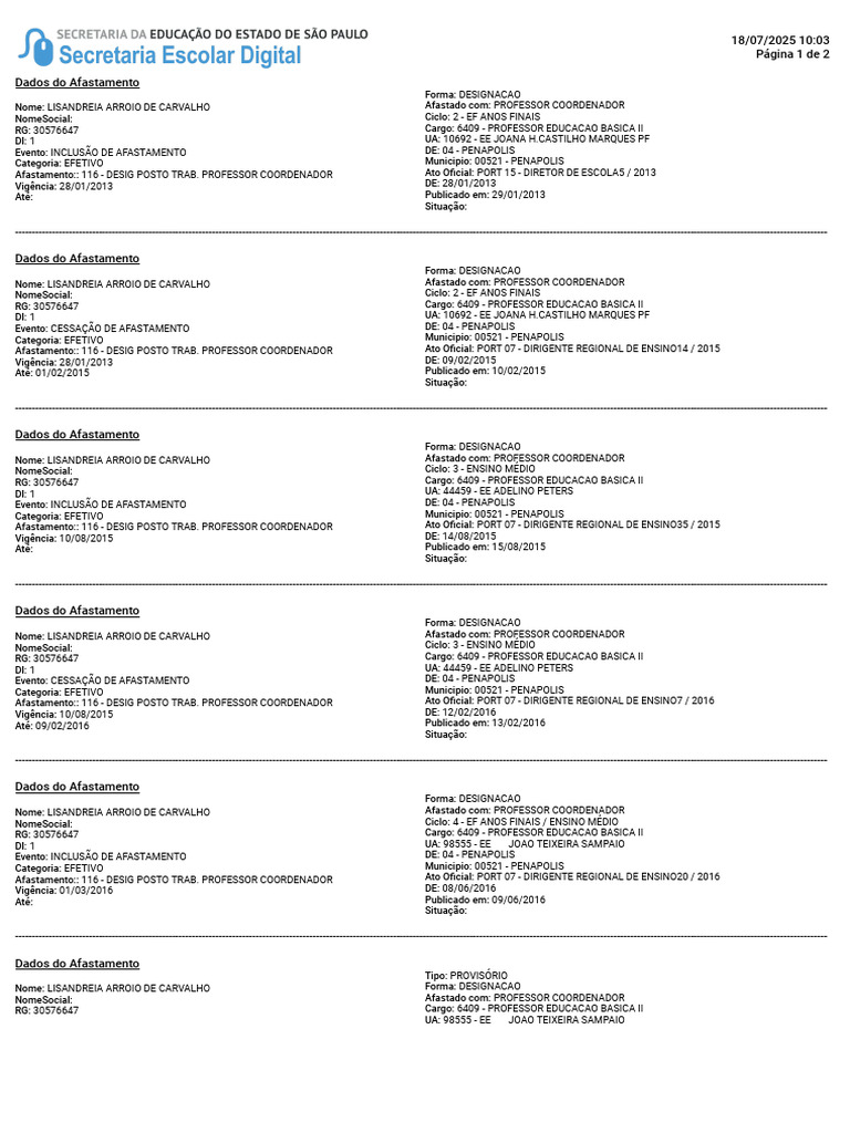 Nome: LISANDREIA ARROIO DE CARVALHO Afastado com: PROFESSOR COORDENADOR