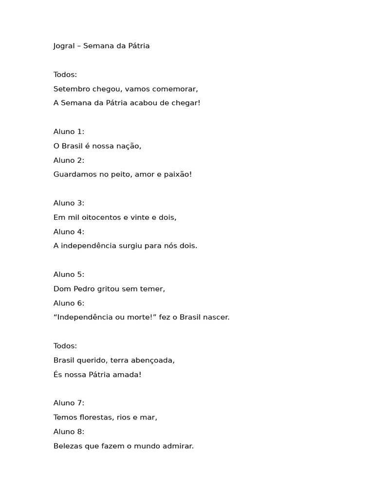 O jogral celebra a Semana da Pátria, destacando o amor e a paixão pelo Brasil. Os alunos relembram a independência do país e enfatizam a importância da união, educação e respeito para um futuro melhor. A apresentação termina com um forte clamor de orgulho e esperança pela nação.