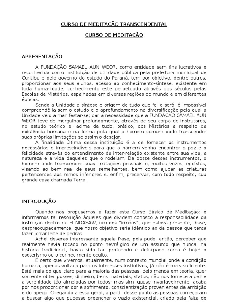 INTRODUÇÃO Quando nos propusemos a fazer este Curso Básico de Meditação; e informamos tal resolução àqueles que dividem conosco a responsabilidade da instrução dentro da FUNDASAW, um dos "irmãos", que estava presente, disse, despreocupadamente, que nosso objetivo seria idêntico ao da pessoa que tenta fazer jorrar leite de pedras. Achei deveras interessante aquela frase, pois pude, então, perceber que realmente havia tocado no ponto nevrálgico de um assunto que nunca, na história tradicional, havia sido tão profanado e deturpado como é hoje: o esoterismo ou o conhecimento oculto. É certo que vivemos, atualmente, num contexto mundial onde a condição humana, apenas voltada para os interesses instintivos, já não é mais suficiente. Está mais do que claro para a maioria das pessoas, pelo menos em teoria, quer somente obter posses, dinheiro, bens materiais, status, não nos fornece a paz e a serenidade tão almejadas por todos; mas sim, quase invariavelmente, acaba por nos proporcionar dor e sofrimento, conscientização provenientes da ambição e do apego. Chegando a essa geral, a partir desse ponto as pessoas começaram a buscar algo que pudesse preencher o vazio existencial, criado pela falta de