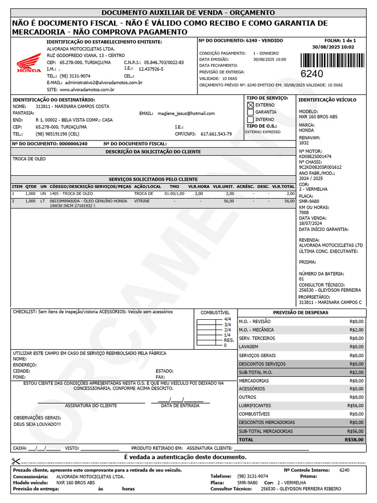E-MAIL: administrativo2@[Link] ORÇAMENTO PRÉVIO Nº: 6240 EMITIDO EM: 30/08/2025 VALIDADE: 10 DIAS
