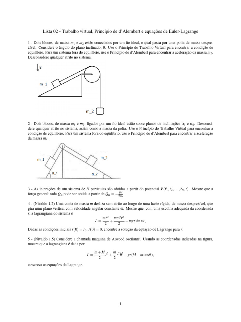 Lista 02 - Trabalho virtual, Princípio de d’Alembert e equações de Euler-Lagrange