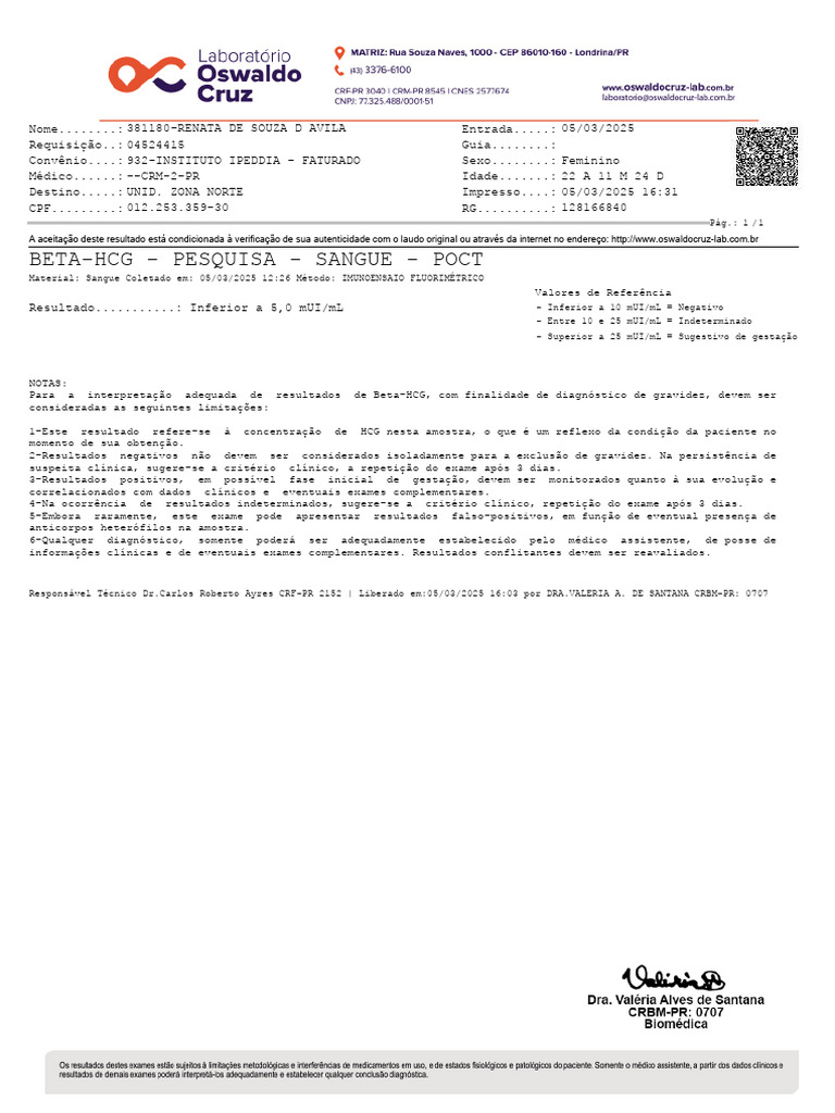 Responsável Técnico [Link] Roberto Ayres CRF-PR 2152 | Liberado em:05/03/2025 16:03 por [Link] A. DE SANTANA CRBM-PR: 0707