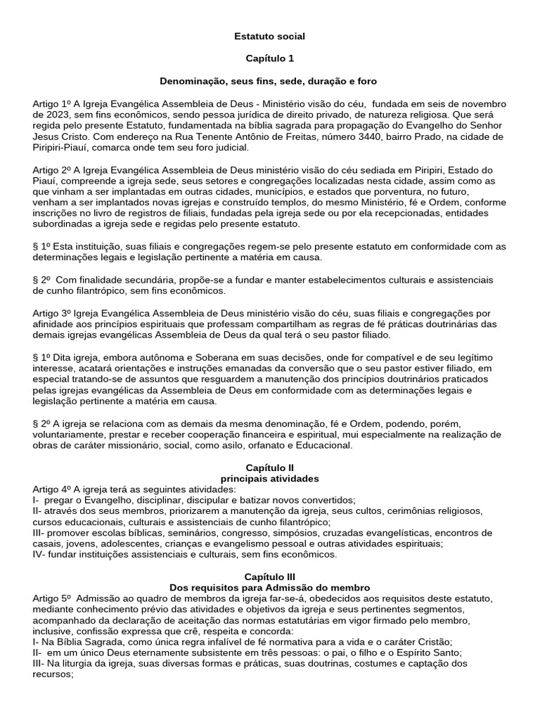 Artigo 2º A Igreja Evangélica Assembleia de Deus ministério visão do céu sediada em Piripiri, Estado do