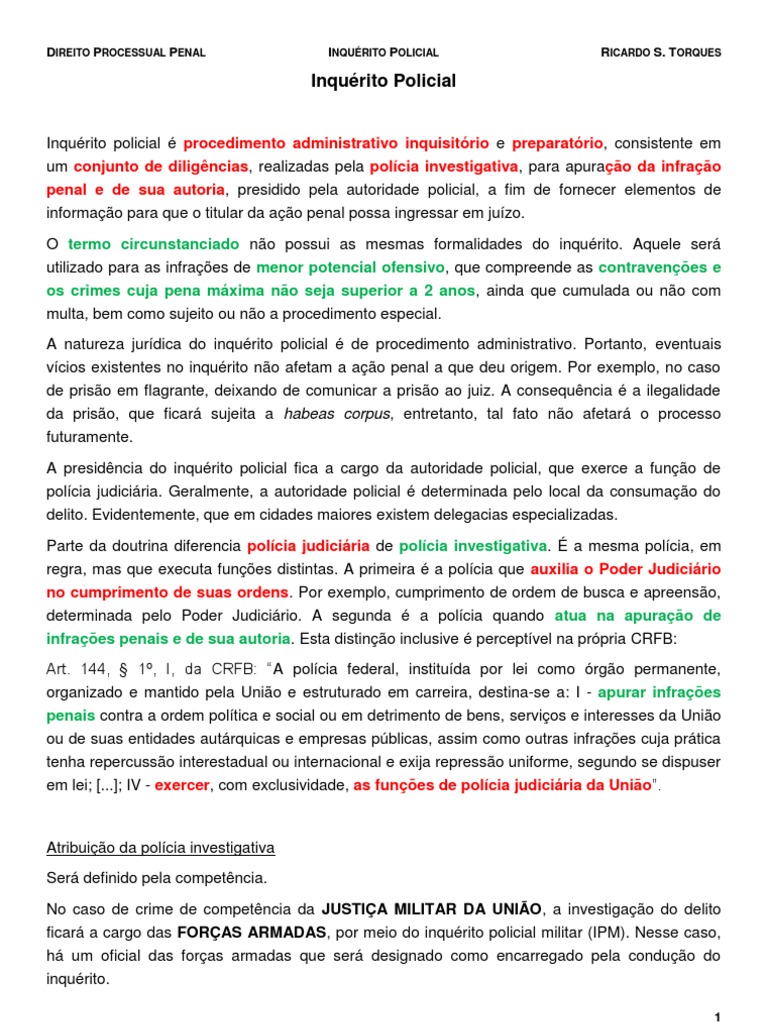 Inqurito policial procedimento administrativo inquisitrio e preparatrio, consistente em um conjunto de diligncias, realizadas pela polcia investigativa, para apurao da infrao penal e de sua autoria, presidido pela autoridade policial, a fim de fornecer elementos de informao para que o titular da ao penal possa ingressar em juzo. O termo circunstanciado no possui as mesmas formalidades do inqurito. Aquele ser utilizado para as infraes de menor potencial ofensivo, que compreende as contravenes e os crimes cuja pena mxima no seja superior a 2 anos, ainda que cumulada ou no com multa, bem como sujeito ou no a procedimento especial. A natureza jurdica do inqurito policial de procedimento administrativo. Portanto, eventuais vcios existentes no inqurito no afetam a ao penal a que deu origem. Por exemplo, no caso de priso em flagrante, deixando de comunicar a priso ao juiz. A consequncia a ilegalidade da priso, que ficar sujeita a habeas corpus, entretanto, tal fato no afetar o processo futuramente. A presidncia do inqurito policial fica a cargo da autoridade policial, que exerce a funo de polcia judiciria. Geralmente, a autoridade policial determinada pelo local da consumao do delito. Evidentemente, que em cidades maiores existem delegacias especializadas. Parte da doutrina diferencia polcia judiciria de polcia investigativa. a mesma polcia, em regra, mas que executa funes distintas. A primeira a polcia que auxilia o Poder Judicirio no cumprimento de suas ordens. Por exemplo, cumprimento de ordem de busca e apreenso, determinada pelo Poder Judicirio. A segunda a polcia quando atua na apurao de infraes penais e de sua autoria. Esta distino inclusive perceptvel na prpria CRFB: Art. 144, 1, I, da CRFB: A polcia federal, instituda por lei como rgo permanente, organizado e mantido pela Unio e estruturado em carreira, destina-se a: I - apurar infraes penais contra a ordem poltica e social ou em detrimento de bens, servios e interesses da Unio ou de suas entidades autrquicas e empresas pblicas, assim como outras infraes cuja prtica tenha repercusso interestadual ou internacional e exija represso uniforme, segundo se dispuser em lei; [...]; IV - exercer, com exclusividade, as funes de polcia judiciria da Unio.