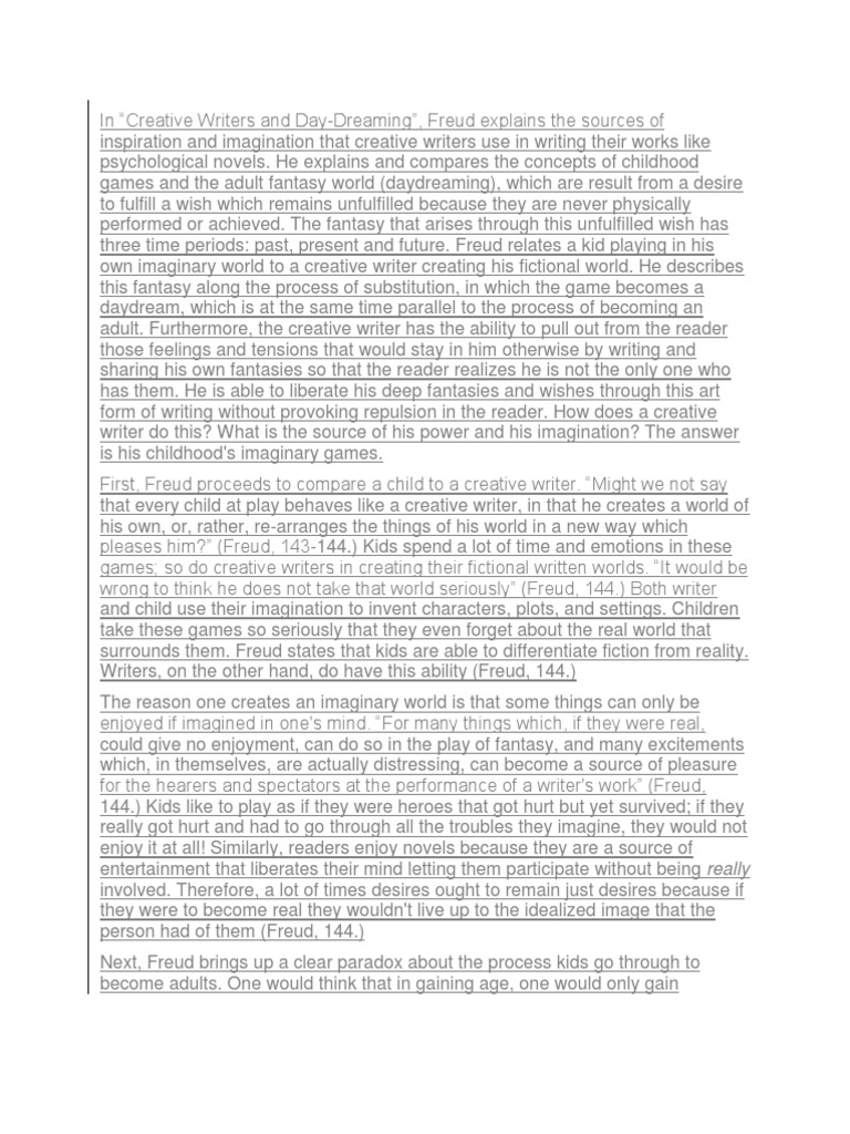 Creative Writing and Daydreaming The essay Creative Writers and Daydreaming suggests Freud's interest in the relationship between the author and his work. He sees a piece of creative writing as a continuation or substitute for the play of childhood. Freud also displays some aspects of his approach to the psychology of the reader. He suggests that the superficial pleasure of the work releases to deeper psychic pleasure and thereby liberate tensions. Thus, reading a text knows the psyche of the author. Human beings have innumerable wishes and desires that can't be expressed freely due to social boundary, morality and other restrictions. The desires remain suppressed in our unconscious level of mind. Somehow, we try to express those desires and, according to Freud, there are three ways to do so- Sex, tongue slips and writing. Artists take help of writing to express his repressed desires of their childhood. He fantasizes and creates daydreams in place of playing games of their childhood. Through writing, the author expresses his desires. He remembers his golden past and wants to express the experience of the past in the present but can't do so. Therefore, he fantasizes and manifests his wishes in the form of art. During childhood, a child plays with the mother's body