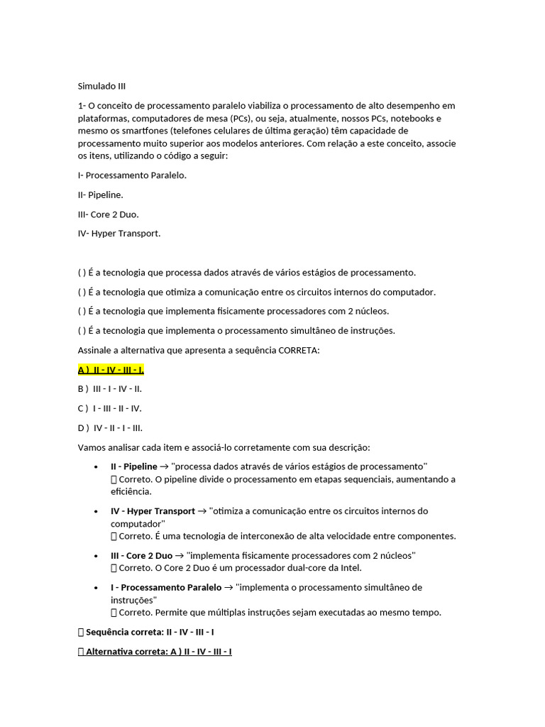 I - Processamento Paralelo → "implementa o processamento simultâneo de