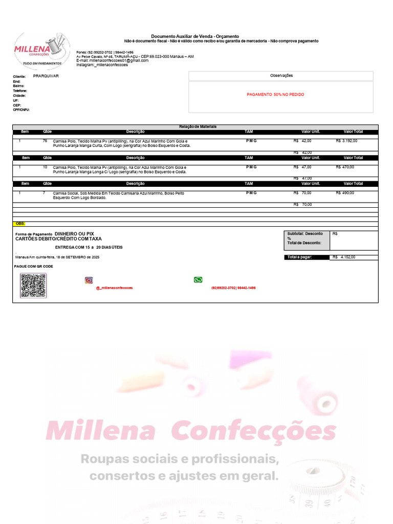 Manaus/Am quinta-feira, 18 de SETEMBRO de 2025 Total a pagar: R$ 4.152,00
