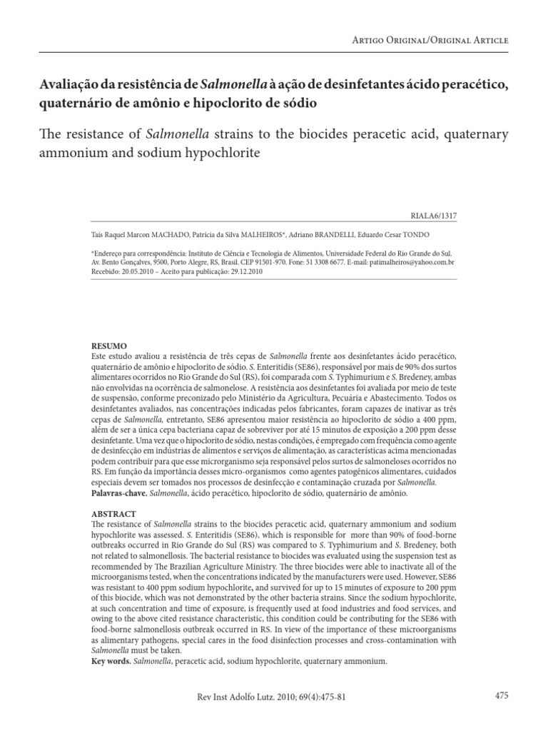 Machado TRM, Malheiros PS, Brandelli A, Tondo EC. Avaliação da resistência de Salmonella à ação de desinfetantes ácido peracético,